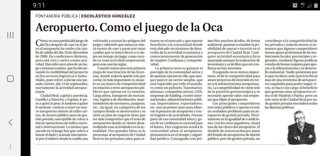 Ciudad Real, capital y provincia, Castilla La Mancha, y España, le pese a quien le pese, le moleste a quien le moleste, vuelven a tener un nuevo aeropuerto abierto al tráfico aéreo, de interés público pero de gestión privada, susceptible de volver a iniciar operaciones de tráfico nacional e internacional. Lo mismo que sucede en el juego hay que volver a lanzar el dado y avanzar nuevamente por el tablero desde la casilla uno volviendo a sortear los peligros del juego y sabiendo que nunca se estará exento de caer y pasar por otras casillas que te inmovilicen o te dejen un tiempo sin jugar, como sucede en toda actividad empresarial, pero esas son las reglas